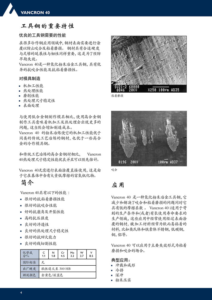 瑞典進(jìn)口V40(VANCRON 40)粉末高速鋼:富氮的粉末冶金模具鋼,具有非常好的抗粘著和抗粘著磨損性能,通常不必做涂覆。...