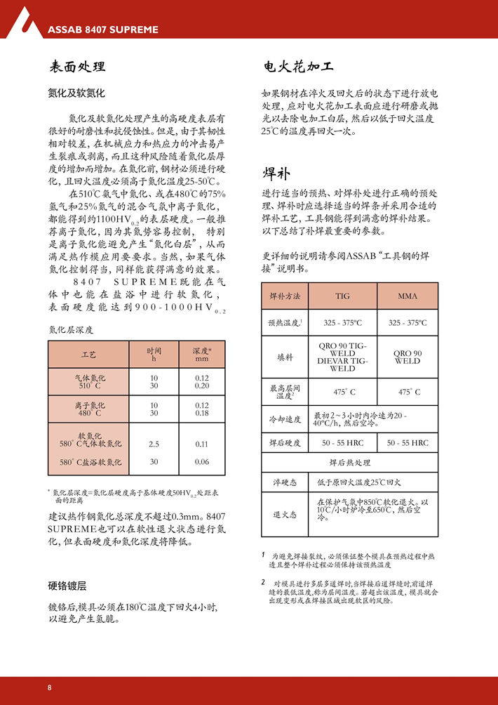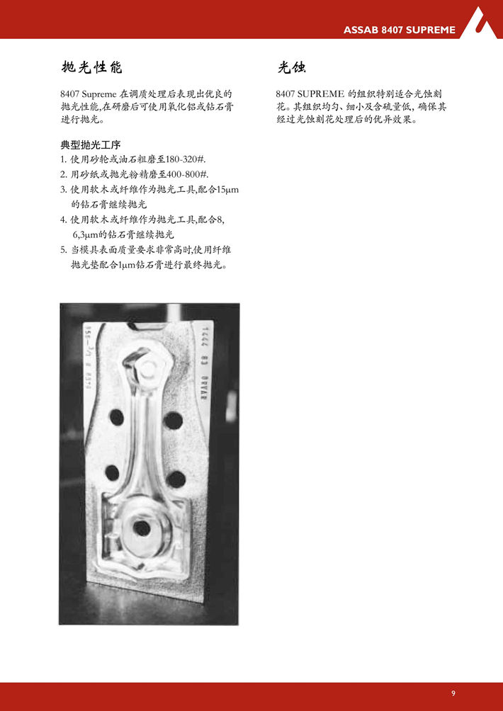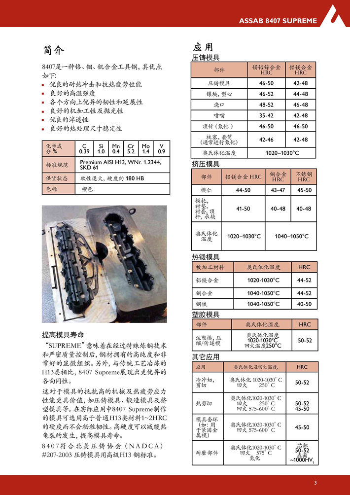 瑞典進(jìn)口8407熱作模具鋼:優(yōu)良的抗熱龜裂性能,符合北美壓鑄協(xié)會(huì)NADCA207-2003優(yōu)質(zhì)壓鑄模具鋼材標(biāo)準(zhǔn)...
